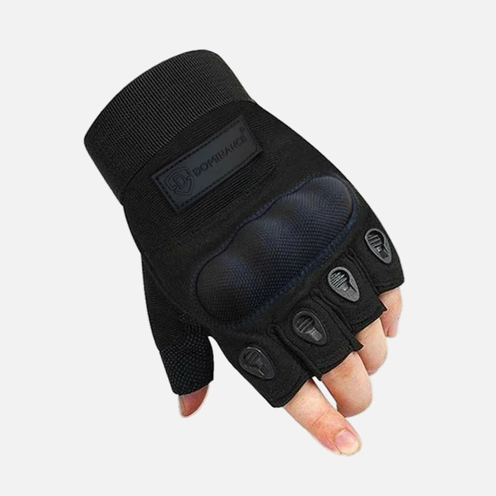 Half-finger Dominance unisex gloves, to be used as motorcycle gloves, bike gloves, gym gloves, riding gloves, driving gloves, weightlifting gloves, cycling gloves, CrossFit gloves, and bodybuilding gloves. They provide extra grip and fitness.